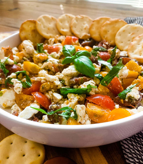 - 1. Prepare the Tomato Mixture: In a medium bowl, combine chopped tomatoes, basil, garlic, and Mama Petrillo’s Italian Dressing. Mix well.